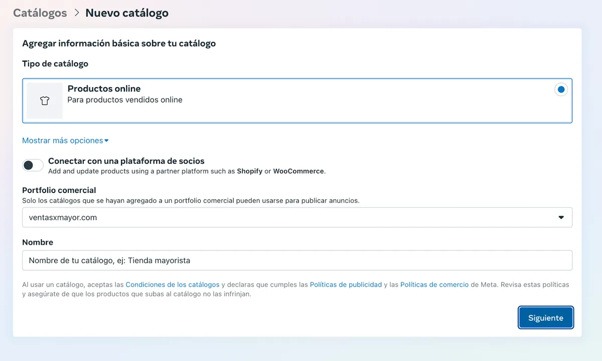 - Ingresa un nombre descriptivo para el catálogo (por ejemplo, el nombre de tu tienda).